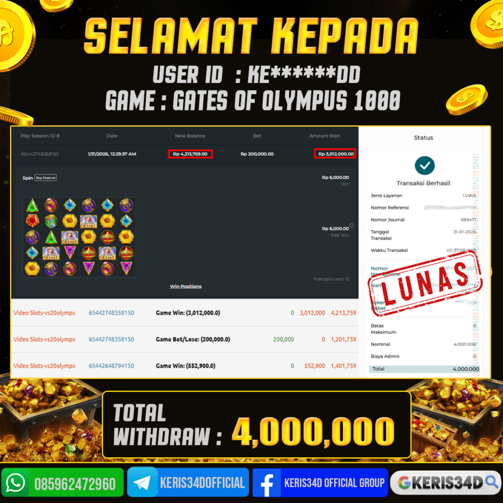 KERIS34D dikenal sebagai situs terpercaya yang selalu menghadirkan pengalaman bermain slot online yang aman, fair, dan berlisensi resmi. Di sini, kami tidak hanya sekadar memberikan janji, tapi bukti nyata berupa slip kemenangan yang dapat Anda lihat secara langsung.