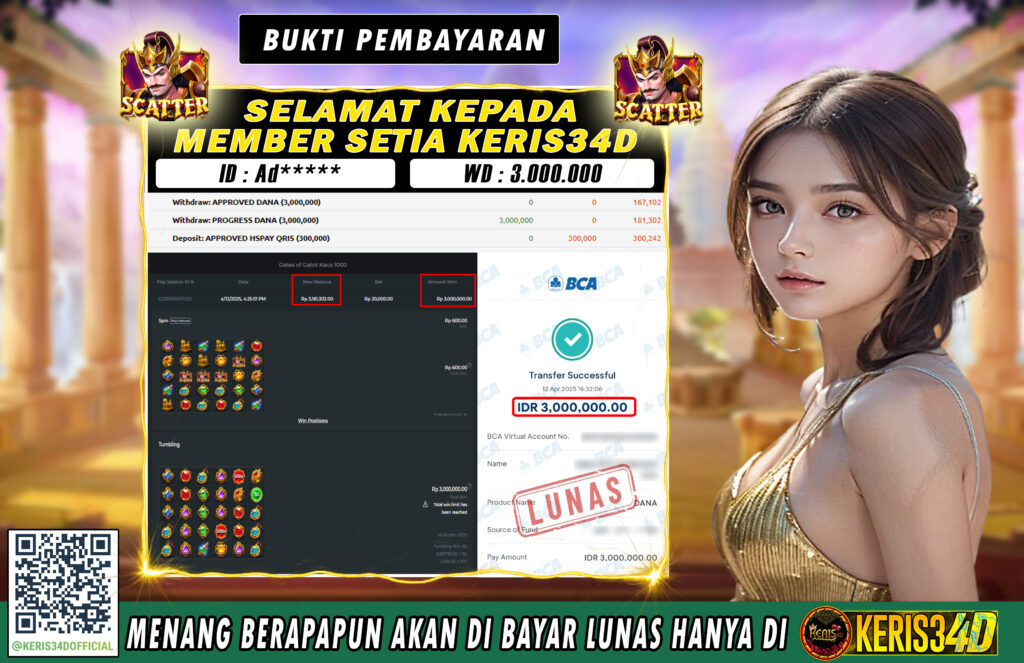 Setiap hari, member KERIS34D berhasil meraih jackpot besar dari berbagai provider slot ternama yang kami sediakan, seperti Pragmatic Play, Habanero, PG Soft, dan masih banyak lagi. Kami secara rutin menampilkan bukti screenshot atau rekapan kemenangan yang berhasil diraih, mulai dari kemenangan ratusan ribu hingga puluhan juta rupiah. Semua slip kemenangan ini kami hadirkan untuk membuktikan bahwa di KERIS34D, peluang menang itu nyata