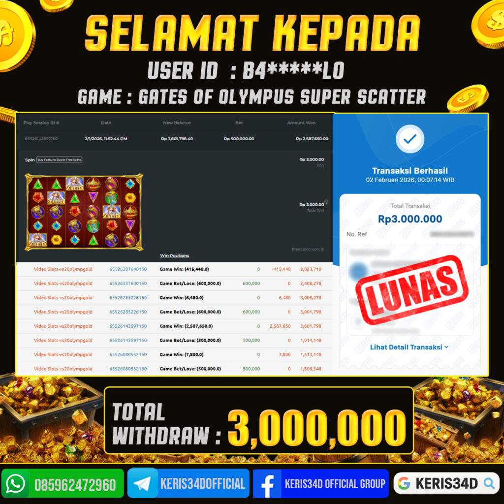 KERIS34D dikenal sebagai situs terpercaya yang selalu menghadirkan pengalaman bermain slot online yang aman, fair, dan berlisensi resmi. Di sini, kami tidak hanya sekadar memberikan janji, tapi bukti nyata berupa slip kemenangan yang dapat Anda lihat secara langsung.