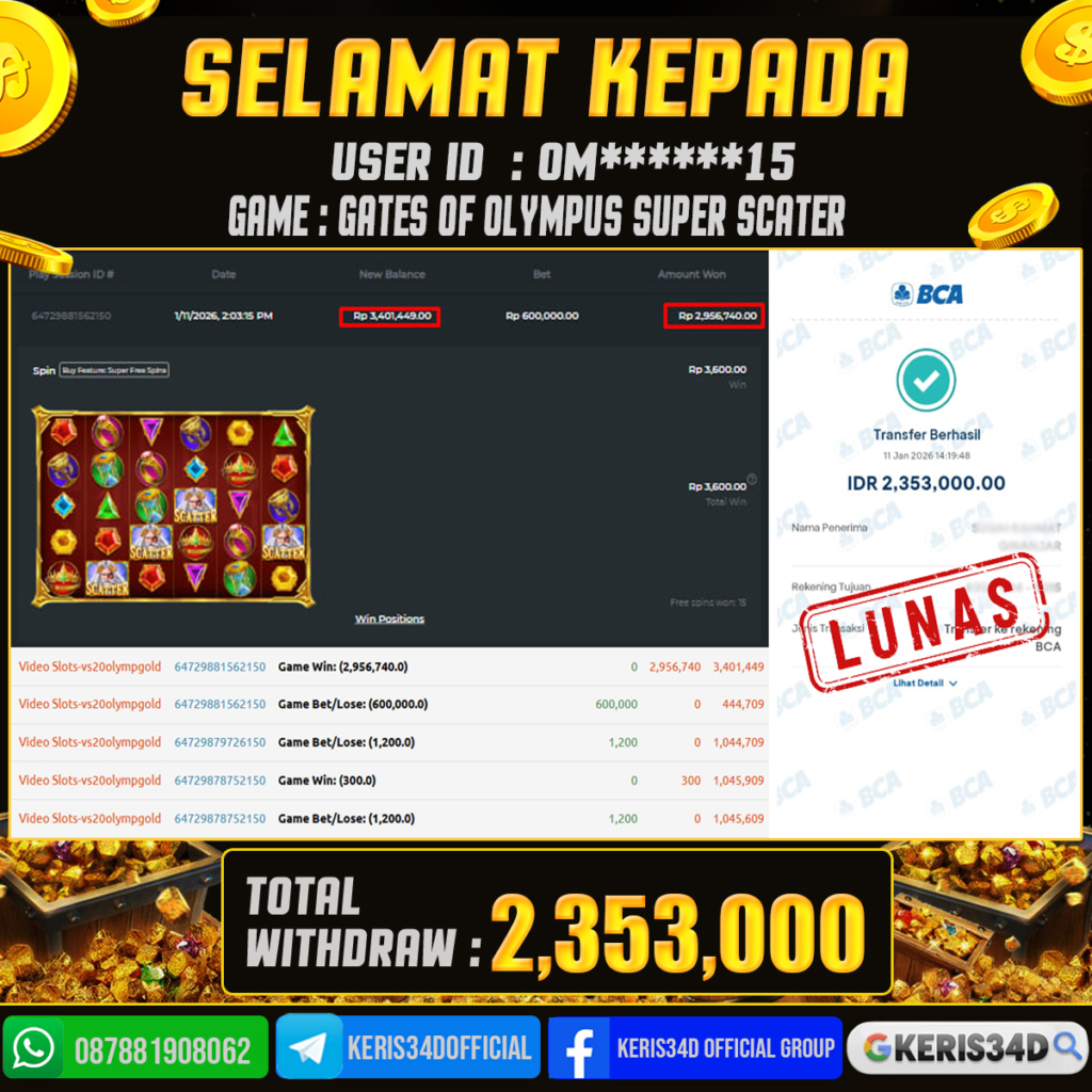 Setiap hari, member KERIS34D berhasil meraih jackpot besar dari berbagai provider slot ternama yang kami sediakan, seperti Pragmatic Play, Habanero, PG Soft, dan masih banyak lagi. Kami secara rutin menampilkan bukti screenshot atau rekapan kemenangan yang berhasil diraih, mulai dari kemenangan ratusan ribu hingga puluhan juta rupiah. Semua slip kemenangan ini kami hadirkan untuk membuktikan bahwa di KERIS34D, peluang menang itu nyata