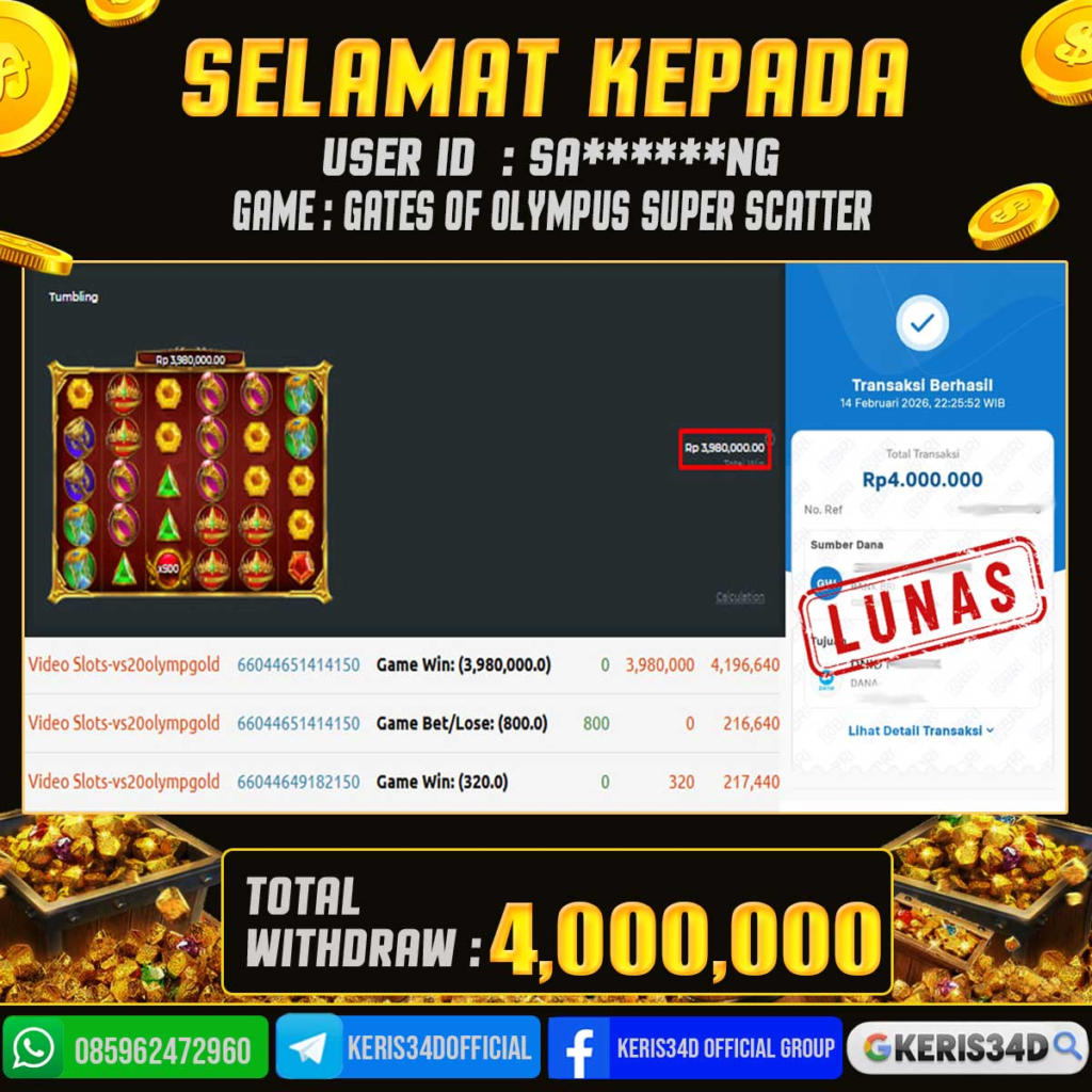 KERIS34D dikenal sebagai situs terpercaya yang selalu menghadirkan pengalaman bermain slot online yang aman, fair, dan berlisensi resmi. Di sini, kami tidak hanya sekadar memberikan janji, tapi bukti nyata berupa slip kemenangan yang dapat Anda lihat secara langsung.