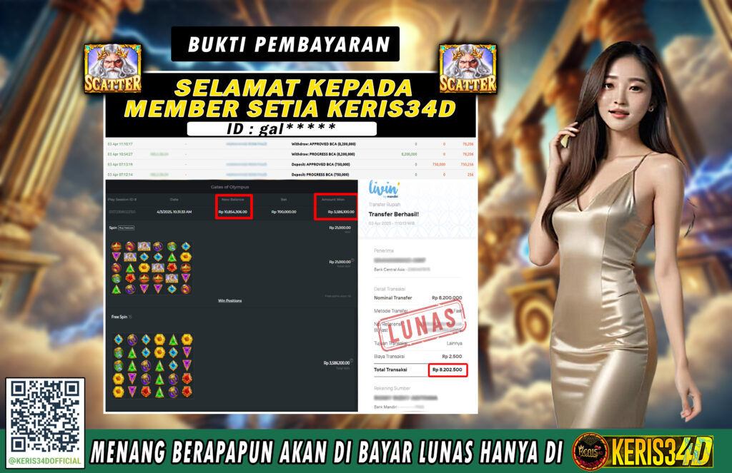 Setiap hari, member KERIS34D berhasil meraih jackpot besar dari berbagai provider slot ternama yang kami sediakan, seperti Pragmatic Play, Habanero, PG Soft, dan masih banyak lagi. Kami secara rutin menampilkan bukti screenshot atau rekapan kemenangan yang berhasil diraih, mulai dari kemenangan ratusan ribu hingga puluhan juta rupiah. Semua slip kemenangan ini kami hadirkan untuk membuktikan bahwa di KERIS34D, peluang menang itu nyata