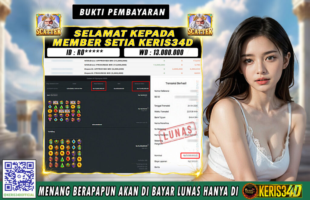 Setiap hari, member KERIS34D berhasil meraih jackpot besar dari berbagai provider slot ternama yang kami sediakan, seperti Pragmatic Play, Habanero, PG Soft, dan masih banyak lagi. Kami secara rutin menampilkan bukti screenshot atau rekapan kemenangan yang berhasil diraih, mulai dari kemenangan ratusan ribu hingga puluhan juta rupiah. Semua slip kemenangan ini kami hadirkan untuk membuktikan bahwa di KERIS34D, peluang menang itu nyata