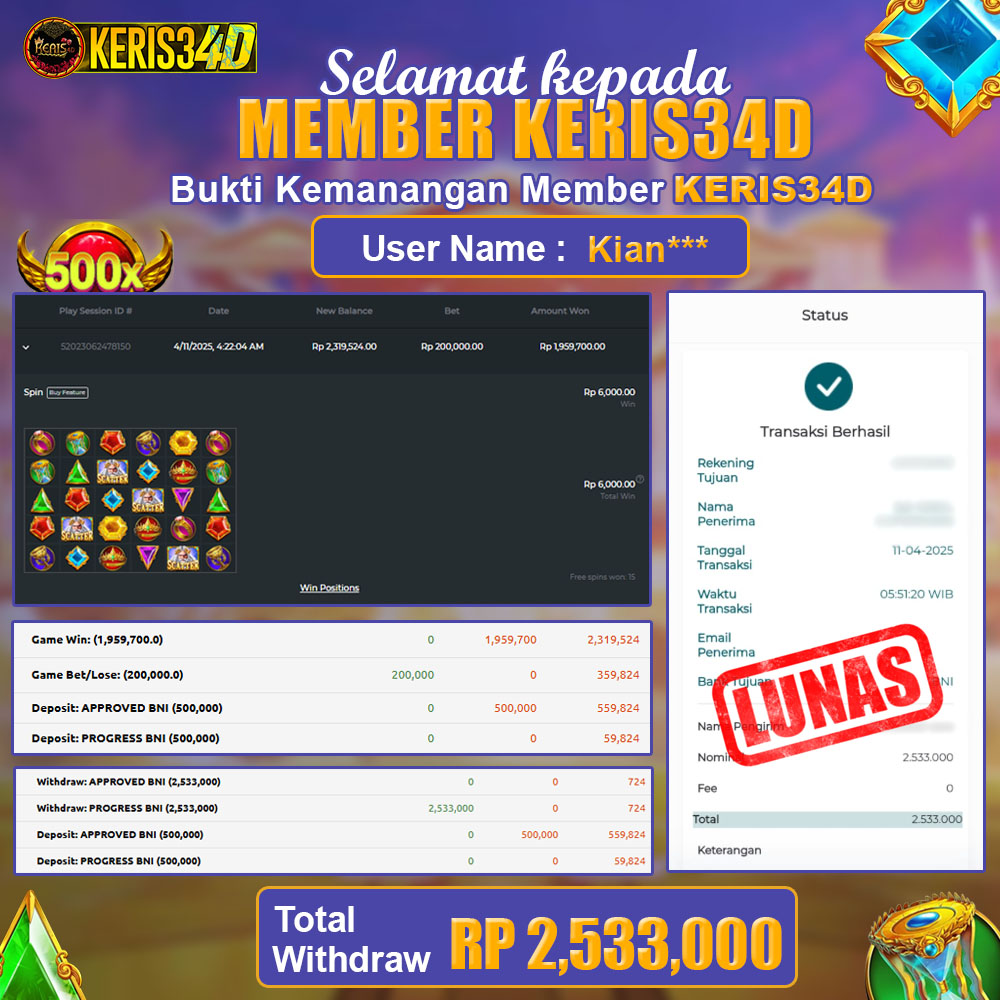 KERIS34D dikenal sebagai situs terpercaya yang selalu menghadirkan pengalaman bermain slot online yang aman, fair, dan berlisensi resmi. Di sini, kami tidak hanya sekadar memberikan janji, tapi bukti nyata berupa slip kemenangan yang dapat Anda lihat secara langsung.