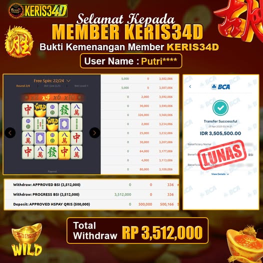 Setiap hari, member KERIS34D berhasil meraih jackpot besar dari berbagai provider slot ternama yang kami sediakan, seperti Pragmatic Play, Habanero, PG Soft, dan masih banyak lagi. Kami secara rutin menampilkan bukti screenshot atau rekapan kemenangan yang berhasil diraih, mulai dari kemenangan ratusan ribu hingga puluhan juta rupiah. Semua slip kemenangan ini kami hadirkan untuk membuktikan bahwa di KERIS34D, peluang menang itu nyata