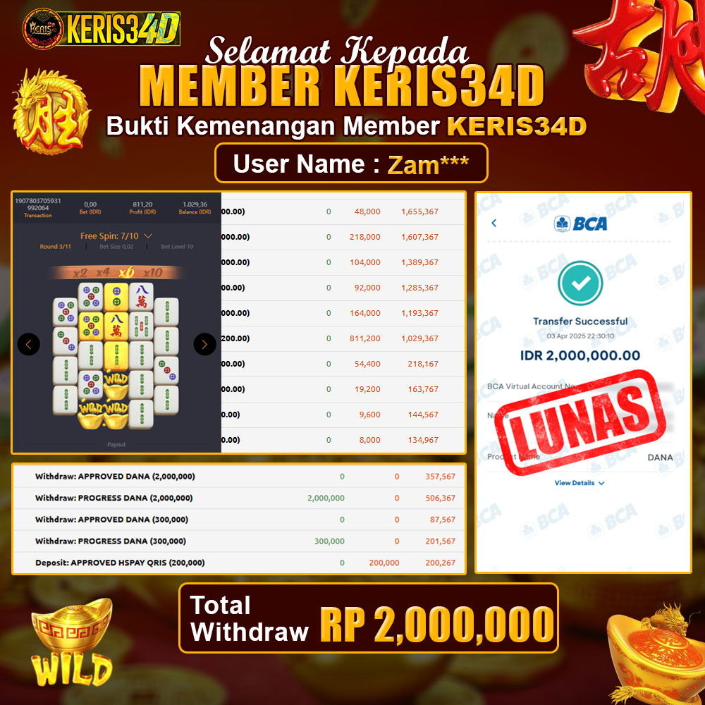 Setiap hari, member KERIS34D berhasil meraih jackpot besar dari berbagai provider slot ternama yang kami sediakan, seperti Pragmatic Play, Habanero, PG Soft, dan masih banyak lagi. Kami secara rutin menampilkan bukti screenshot atau rekapan kemenangan yang berhasil diraih, mulai dari kemenangan ratusan ribu hingga puluhan juta rupiah. Semua slip kemenangan ini kami hadirkan untuk membuktikan bahwa di KERIS34D, peluang menang itu nyata