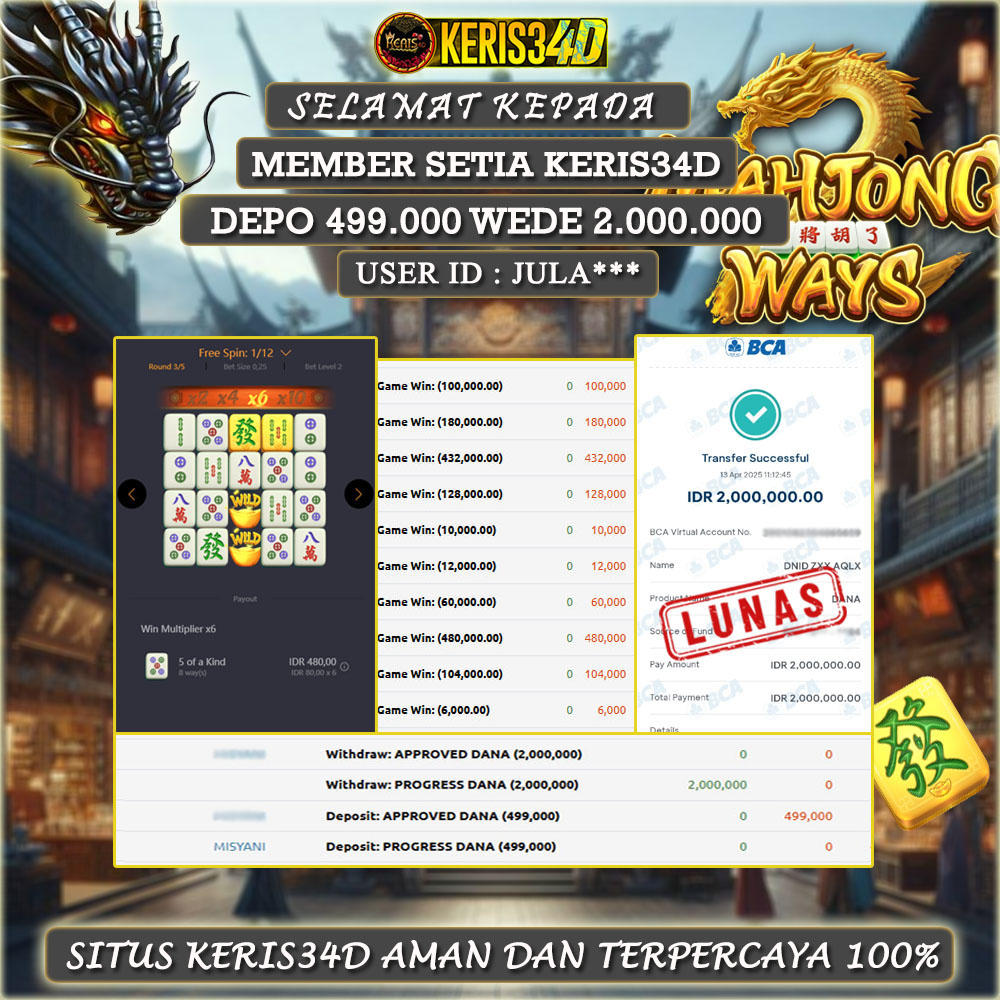 Setiap hari, member KERIS34D berhasil meraih jackpot besar dari berbagai provider slot ternama yang kami sediakan, seperti Pragmatic Play, Habanero, PG Soft, dan masih banyak lagi. Kami secara rutin menampilkan bukti screenshot atau rekapan kemenangan yang berhasil diraih, mulai dari kemenangan ratusan ribu hingga puluhan juta rupiah. Semua slip kemenangan ini kami hadirkan untuk membuktikan bahwa di KERIS34D, peluang menang itu nyata