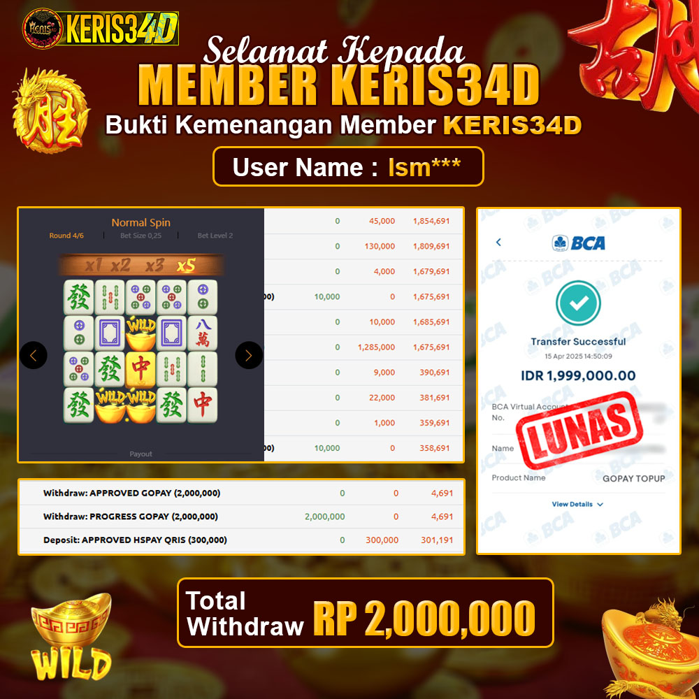 Setiap hari, member KERIS34D berhasil meraih jackpot besar dari berbagai provider slot ternama yang kami sediakan, seperti Pragmatic Play, Habanero, PG Soft, dan masih banyak lagi. Kami secara rutin menampilkan bukti screenshot atau rekapan kemenangan yang berhasil diraih, mulai dari kemenangan ratusan ribu hingga puluhan juta rupiah. Semua slip kemenangan ini kami hadirkan untuk membuktikan bahwa di KERIS34D, peluang menang itu nyata