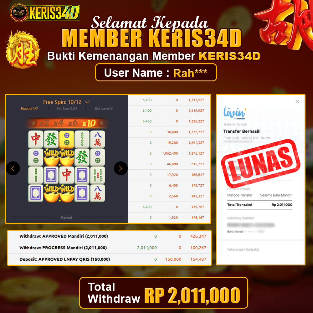 Setiap hari, member KERIS34D berhasil meraih jackpot besar dari berbagai provider slot ternama yang kami sediakan, seperti Pragmatic Play, Habanero, PG Soft, dan masih banyak lagi. Kami secara rutin menampilkan bukti screenshot atau rekapan kemenangan yang berhasil diraih, mulai dari kemenangan ratusan ribu hingga puluhan juta rupiah. Semua slip kemenangan ini kami hadirkan untuk membuktikan bahwa di KERIS34D, peluang menang itu nyata