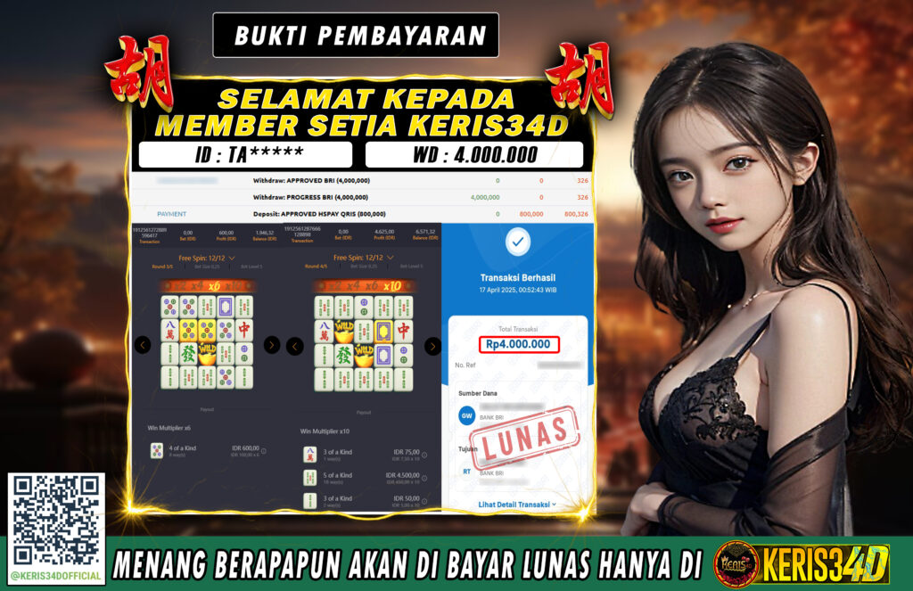 KERIS34D dikenal sebagai situs terpercaya yang selalu menghadirkan pengalaman bermain slot online yang aman, fair, dan berlisensi resmi. Di sini, kami tidak hanya sekadar memberikan janji, tapi bukti nyata berupa slip kemenangan yang dapat Anda lihat secara langsung.