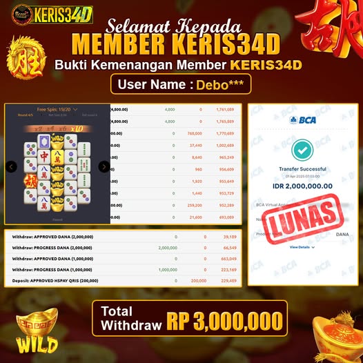 Setiap hari, member KERIS34D berhasil meraih jackpot besar dari berbagai provider slot ternama yang kami sediakan, seperti Pragmatic Play, Habanero, PG Soft, dan masih banyak lagi. Kami secara rutin menampilkan bukti screenshot atau rekapan kemenangan yang berhasil diraih, mulai dari kemenangan ratusan ribu hingga puluhan juta rupiah. Semua slip kemenangan ini kami hadirkan untuk membuktikan bahwa di KERIS34D, peluang menang itu nyata