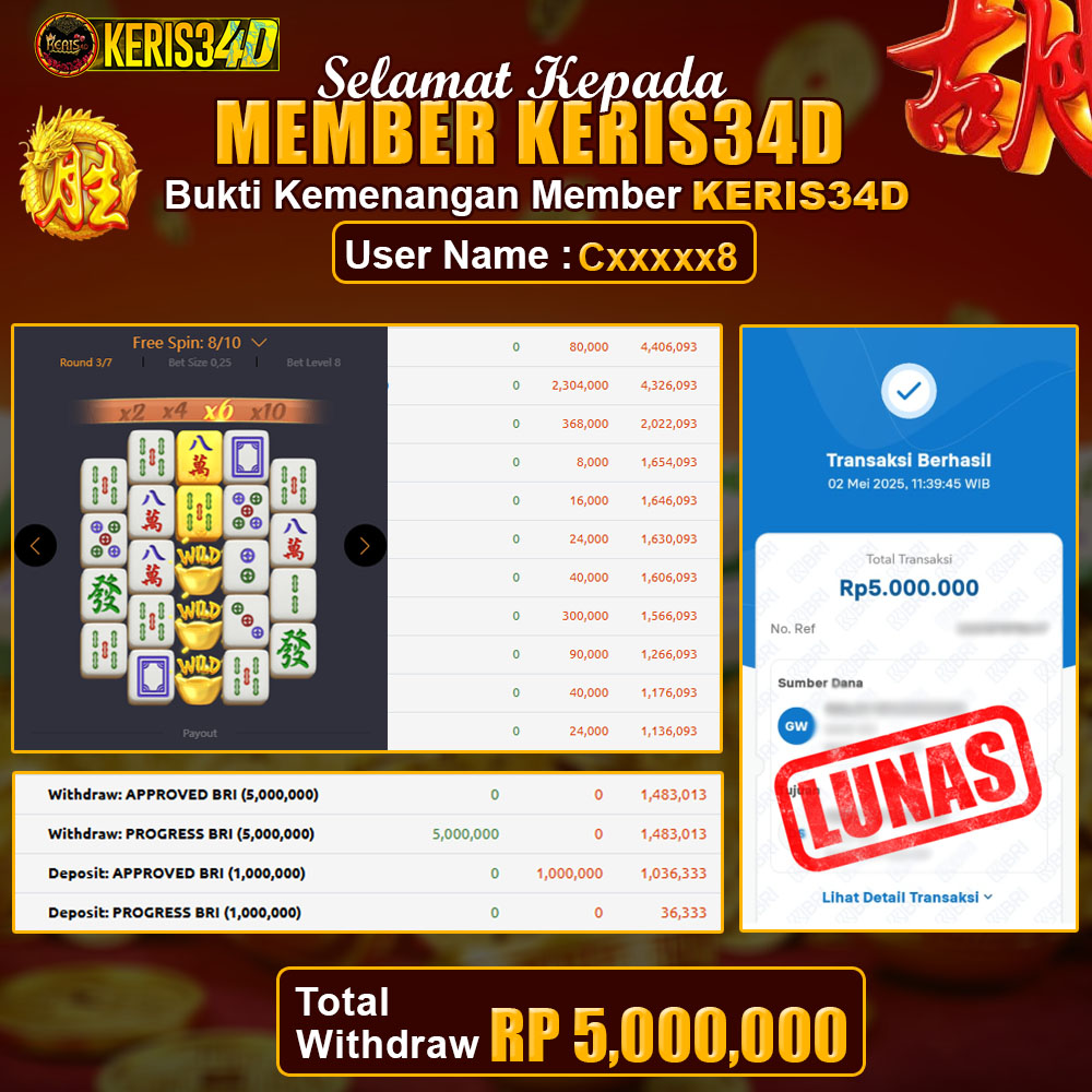 Setiap hari, member KERIS34D berhasil meraih jackpot besar dari berbagai provider slot ternama yang kami sediakan, seperti Pragmatic Play, Habanero, PG Soft, dan masih banyak lagi. Kami secara rutin menampilkan bukti screenshot atau rekapan kemenangan yang berhasil diraih, mulai dari kemenangan ratusan ribu hingga puluhan juta rupiah. Semua slip kemenangan ini kami hadirkan untuk membuktikan bahwa di KERIS34D, peluang menang itu nyata