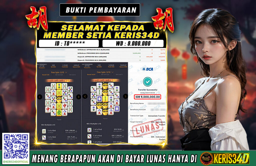 KERIS34D dikenal sebagai situs terpercaya yang selalu menghadirkan pengalaman bermain slot online yang aman, fair, dan berlisensi resmi. Di sini, kami tidak hanya sekadar memberikan janji, tapi bukti nyata berupa slip kemenangan yang dapat Anda lihat secara langsung.