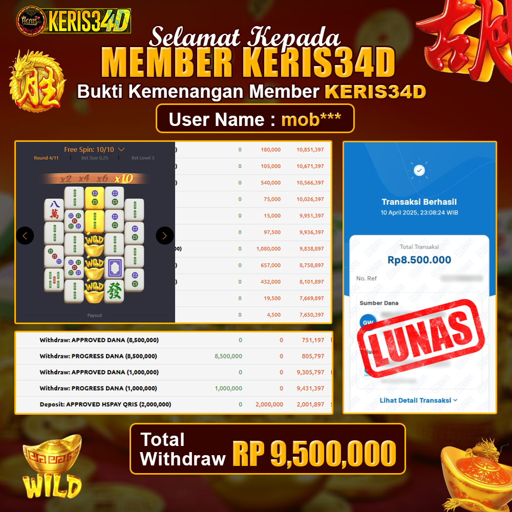 Setiap hari, member KERIS34D berhasil meraih jackpot besar dari berbagai provider slot ternama yang kami sediakan, seperti Pragmatic Play, Habanero, PG Soft, dan masih banyak lagi. Kami secara rutin menampilkan bukti screenshot atau rekapan kemenangan yang berhasil diraih, mulai dari kemenangan ratusan ribu hingga puluhan juta rupiah. Semua slip kemenangan ini kami hadirkan untuk membuktikan bahwa di KERIS34D, peluang menang itu nyata