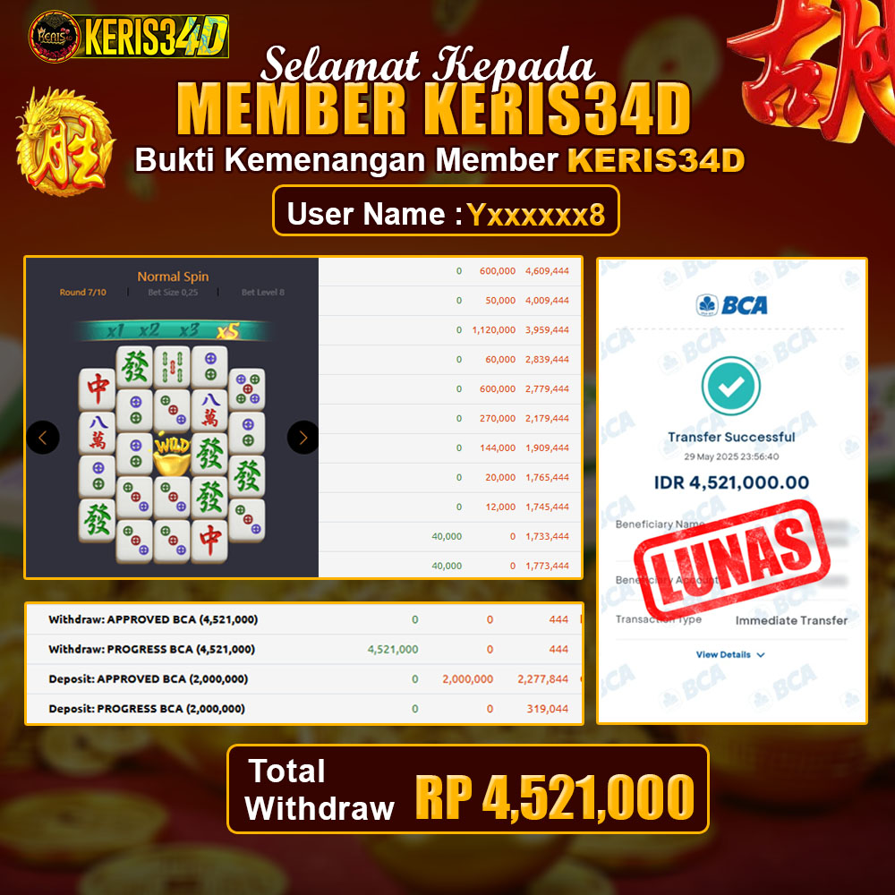 Setiap hari, member KERIS34D berhasil meraih jackpot besar dari berbagai provider slot ternama yang kami sediakan, seperti Pragmatic Play, Habanero, PG Soft, dan masih banyak lagi. Kami secara rutin menampilkan bukti screenshot atau rekapan kemenangan yang berhasil diraih, mulai dari kemenangan ratusan ribu hingga puluhan juta rupiah. Semua slip kemenangan ini kami hadirkan untuk membuktikan bahwa di KERIS34D, peluang menang itu nyata