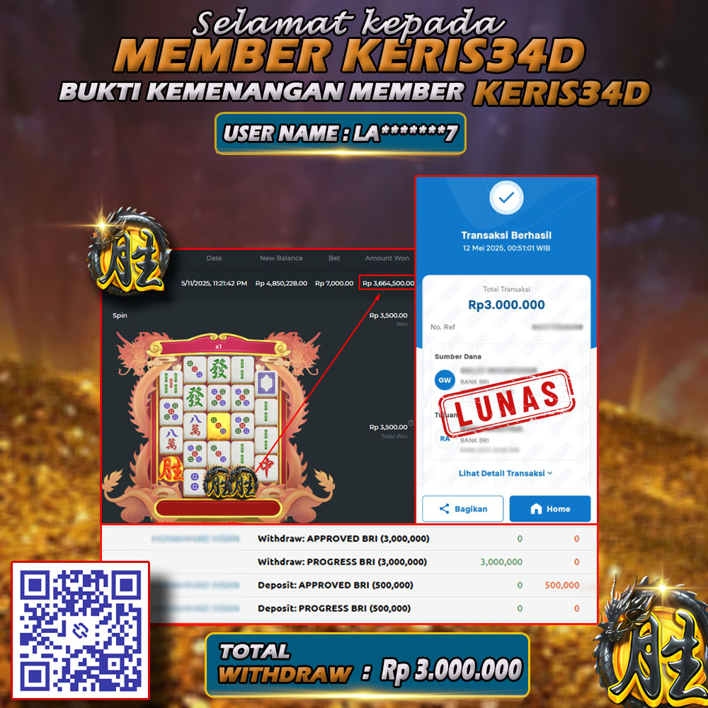 Setiap hari, member KERIS34D berhasil meraih jackpot besar dari berbagai provider slot ternama yang kami sediakan, seperti Pragmatic Play, Habanero, PG Soft, dan masih banyak lagi. Kami secara rutin menampilkan bukti screenshot atau rekapan kemenangan yang berhasil diraih, mulai dari kemenangan ratusan ribu hingga puluhan juta rupiah. Semua slip kemenangan ini kami hadirkan untuk membuktikan bahwa di KERIS34D, peluang menang itu nyata