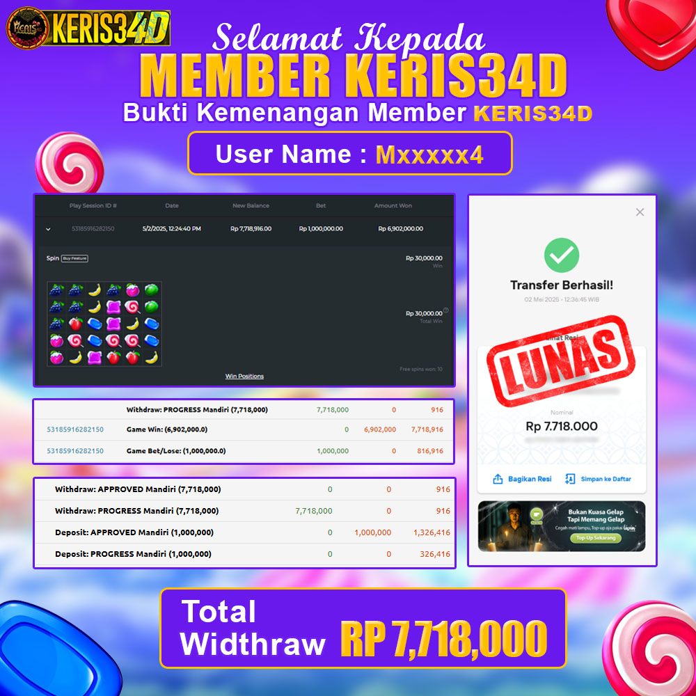 Setiap hari, member KERIS34D berhasil meraih jackpot besar dari berbagai provider slot ternama yang kami sediakan, seperti Pragmatic Play, Habanero, PG Soft, dan masih banyak lagi. Kami secara rutin menampilkan bukti screenshot atau rekapan kemenangan yang berhasil diraih, mulai dari kemenangan ratusan ribu hingga puluhan juta rupiah. Semua slip kemenangan ini kami hadirkan untuk membuktikan bahwa di KERIS34D, peluang menang itu nyata