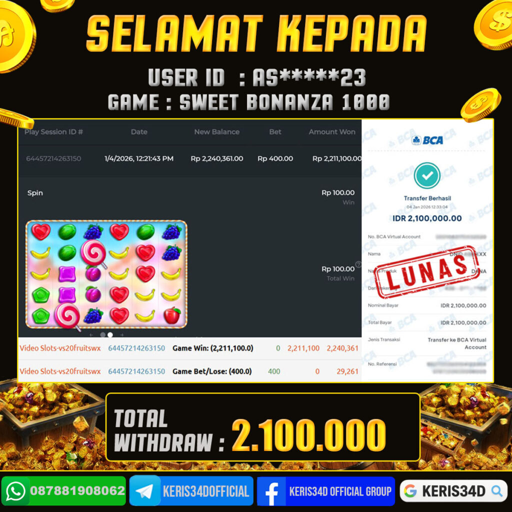 KERIS34D dikenal sebagai situs terpercaya yang selalu menghadirkan pengalaman bermain slot online yang aman, fair, dan berlisensi resmi. Di sini, kami tidak hanya sekadar memberikan janji, tapi bukti nyata berupa slip kemenangan yang dapat Anda lihat secara langsung.