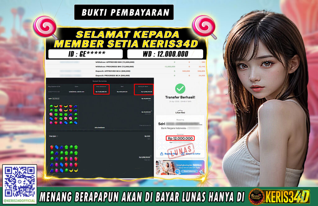 Setiap hari, member KERIS34D berhasil meraih jackpot besar dari berbagai provider slot ternama yang kami sediakan, seperti Pragmatic Play, Habanero, PG Soft, dan masih banyak lagi. Kami secara rutin menampilkan bukti screenshot atau rekapan kemenangan yang berhasil diraih, mulai dari kemenangan ratusan ribu hingga puluhan juta rupiah. Semua slip kemenangan ini kami hadirkan untuk membuktikan bahwa di KERIS34D, peluang menang itu nyata