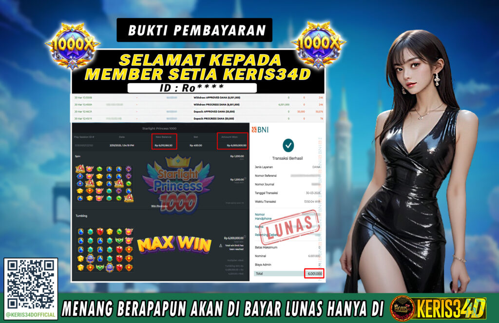 Setiap hari, member KERIS34D berhasil meraih jackpot besar dari berbagai provider slot ternama yang kami sediakan, seperti Pragmatic Play, Habanero, PG Soft, dan masih banyak lagi. Kami secara rutin menampilkan bukti screenshot atau rekapan kemenangan yang berhasil diraih, mulai dari kemenangan ratusan ribu hingga puluhan juta rupiah. Semua slip kemenangan ini kami hadirkan untuk membuktikan bahwa di KERIS34D, peluang menang itu nyata